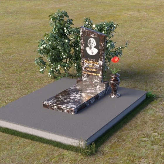 Мемориальная композиция состоит из нескольких элементов, каждый из которых тщательно продуман и выполнен с безупречным качеством. Начинается все с основания – широкой, массивной плиты, которая обеспечивает устойчивость всей конструкции. Её матовая, слегка шероховатая поверхность призвана оттенять блеск полированных элементов, создавая игру фактур и контрастов. Далее взгляд переходит к горизонтальной стеле, расположенной на постаменте. Она выполнена в виде прямоугольника с плавными, скругленными углами, что придает ей мягкость и элегантность. Поверхность стелы отполирована до зеркального блеска, отражая небо и окружающий мир, словно напоминая о связи между земным и небесным. На постаменте возвышается вертикальная стела с портретом и надписью. Верхняя часть стелы имеет скошенный угол, что добавляет динамики и оригинальности всей композиции. На стеле выгравированы имя, фамилия и отчество усопшего, а также даты жизни, выполненные изящным шрифтом. В правом углу композиции расположена ваза, предназначенная для цветов. Её классическая форма и полированная поверхность гармонично дополняют общий стиль мемориала.