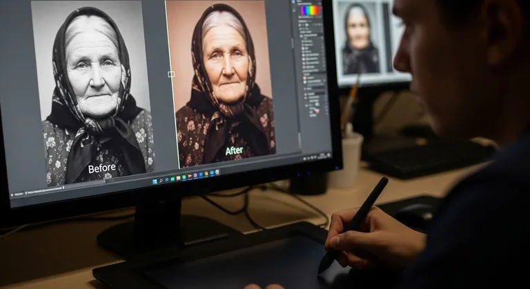 Ключевые задачи: Профессиональная ретушь фотографий, часто старых или поврежденных, для последующей гравировки на камне.