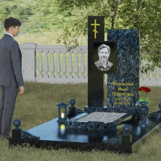 Данное ритуальное изделие представляет собой подлинный образец современного мемориального искусства, в котором строгость архитектурных форм гармонично сочетается с глубоким философским подтекстом. Композиция выстроена на изящном сопоставлении двух вертикальных стел, имеющих разную высоту и фактуру. Асимметричное исполнение символизирует многогранность человеческой жизни: её взлеты и земное завершение. Высокая зеркально-черная стела воплощает собой бесконечность космоса и тишину вечного сна, в то время как примыкающий к ней цветной элемент из благородного камня привносит в ансамбль теплоту земных воспоминаний. Плавные переходы между гранями и безупречная полировка создают ощущение текучести времени, которое застыло в камне, оберегая вечный покой усопшего.
