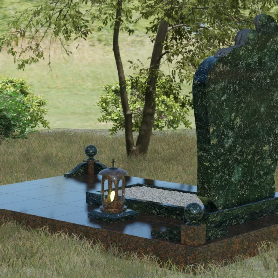 Благоустройство участка выполнено с учетом канонов высокой эстетики и практичности. Основной массив установлен на массивный гранитный цоколь, подчеркивающий надежность всей конструкции. Периметр участка очерчен строгим каменным бордюром, на углах которого возвышаются полированные шары — символы совершенства и завершенности жизненного цикла. Открытый цветник заменен на элегантную надгробную плиту с декоративной отсыпкой из светлой гальки, что не только создает законченный вид, но и значительно упрощает уход за местом памяти. Дополняют ансамбль изящная гранитная ваза для живых цветов и закрытая лампада, чей свет будет защищен камнем в любые непогоды.