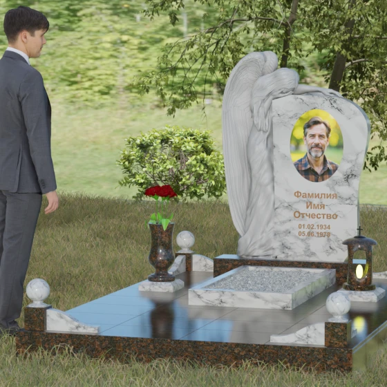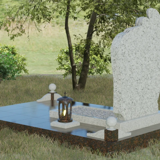 Форма этого надгробия лишена агрессивных острых углов в верхней части, что придает ему мягкость и одухотворенность. Асимметричная верхушка основного массива плавно огибает фигуру ангела, создавая ощущение защиты и покровительства. С точки зрения символизма, ангел здесь выступает не только как страж души, но и как медиатор между мирами, разделяющий горечь утраты с живыми. Каменные шары на столбиках ограждения отсылают к вечности и бесконечности бытия. Массивность основания и использование цельных плит для мощения участка олицетворяют устойчивость памяти, которую не в силах разрушить ни ветры, ни дожди.