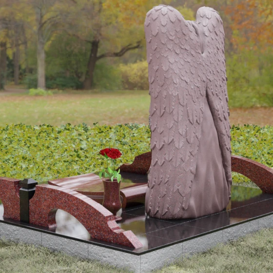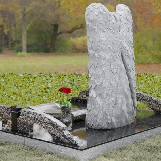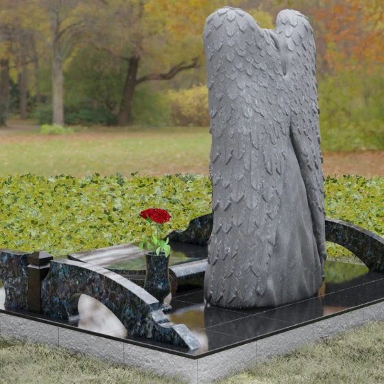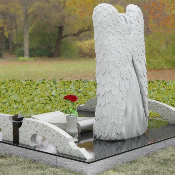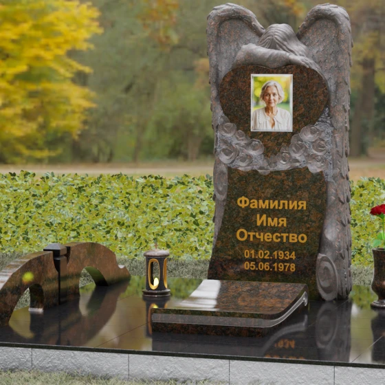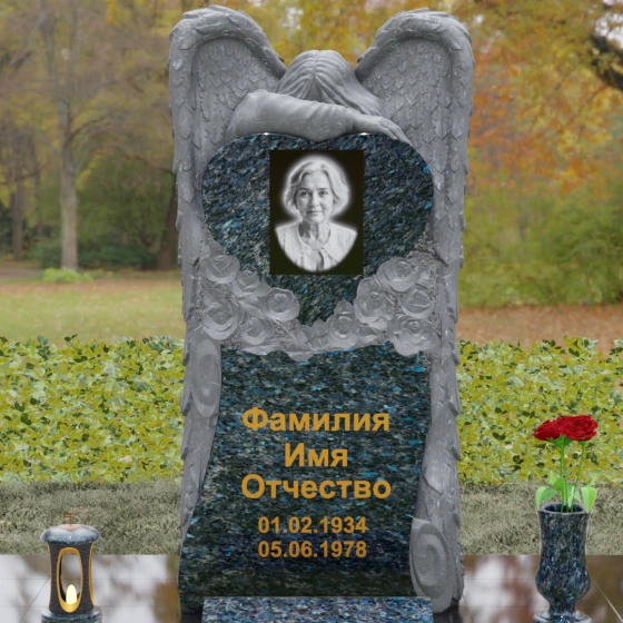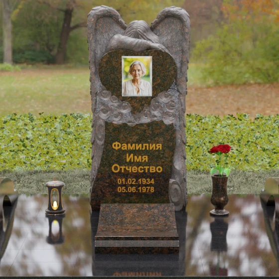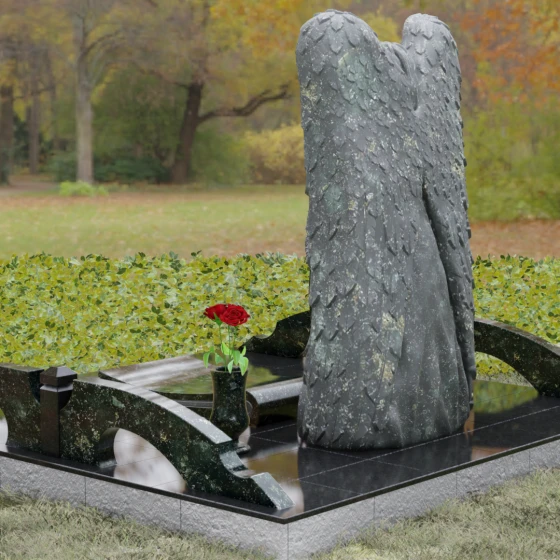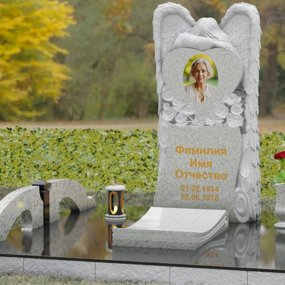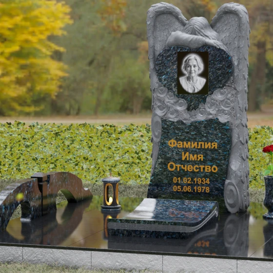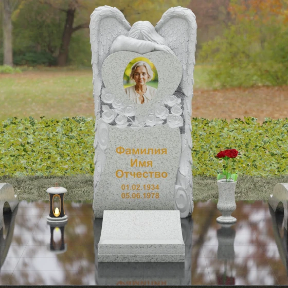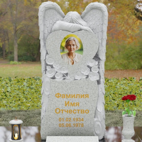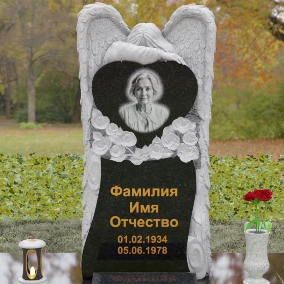 Данная мемориальная композиция представляет собой истинное произведение ритуального искусства, где каждый элемент пропитан глубоким символизмом и благородством. Центральным художественным образом выступает величественная фигура скорбящего ангела, чьи массивные крылья бережно, словно в последней попытке защитить, обрамляют стелу в форме сердца. Мастерство камнереза здесь проявляется в искусной игре контрастов: матовая, детально проработанная фактура оперения крыльев и драпировок одежды небесного покровителя противопоставлена зеркально отполированной глади черного гранита. Именно на этой поверхности, лишенной малейших изъянов, свет преломляется наиболее эффектно, создавая ощущение глубины и монументальности.