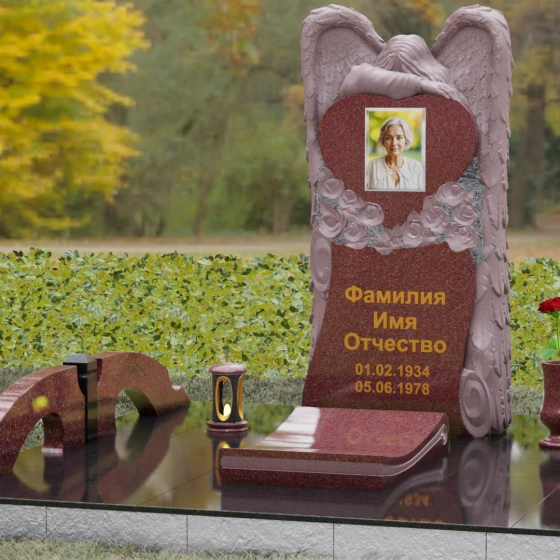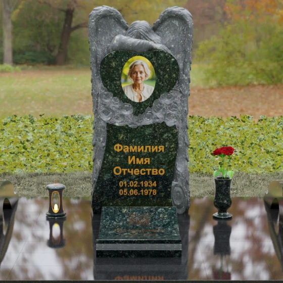 Оформление: Для формы в виде сердца идеально подходит классическая лазерная гравировка или фотокерамика в центре композиции. ФИО и даты жизни рекомендуется наносить сусальным золотом или глубоким пескоструйным методом с последующей окраской под бронзу — это создаст необходимый акцент на фоне темного полированного камня и подчеркнет статусность всего комплекса.