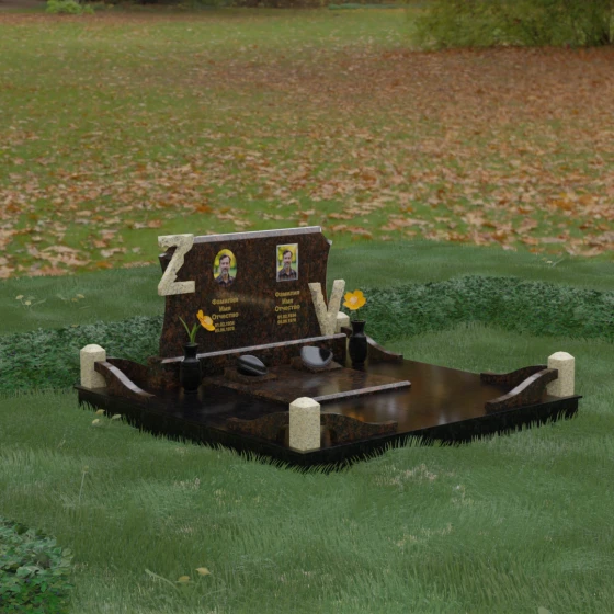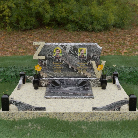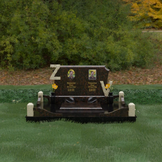 Центральным элементом изделия является массивная горизонтальная стела, обладающая сложной многоуровневой геометрией. Верхняя грань плиты украшена изящными симметричными вырезами, которые смягчают строгость прямоугольных форм и придают конструкции завершенный, эстетически выверенный вид. Особое внимание привлекает игра контрастов: глубокая зеркальная полировка основного массива камня эффектно подчеркивается светлыми вставками. Рельефные буквы Z и V, выполненные из контрастного гранита, выступают над поверхностью, создавая впечатляющий эффект объема и наделяя монумент уникальным характером.