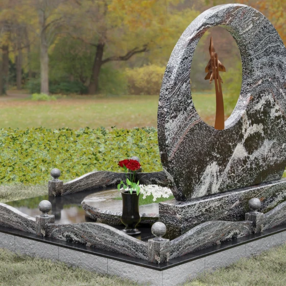 Выбор мемориальной композиции — это всегда поиск баланса между земной скорбью и небесным триумфом человеческого духа. Данная величественная стела, выполненная в уникальной геометрии круга с асимметричным сквозным вырезом, представляет собой не просто памятный знак, а глубокое философское высказывание. Символизм окружности отсылает нас к идее бесконечности, небесного свода и завершенности жизненного пути. Внутреннее пространство стелы акцентировано филигранной металлической фигурой взмывающего ввысь истребителя. Этот элемент несет в себе мощный эмоциональный заряд: он олицетворяет прорыв сквозь земные преграды, вечный полет и верность призванию, которое сильнее самой смерти.
