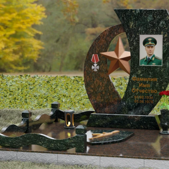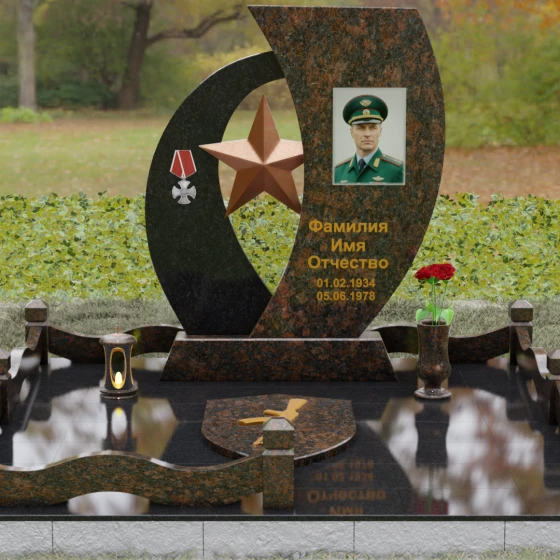 Кому подойдет: Данный мемориальный комплекс спроектирован для увековечивания памяти мужчин, чья жизнь была связана с воинским долгом, государственной службой или героическими поступками. Он станет достойным символом последнего пристанища для ветерана, кадрового офицера или человека с твердым характером. Армейская символика в сочетании с изысканным европейским стилем благоустройства (каменная ваза для живых цветов, лаконичная лампада на постаменте) подчеркивает уважение семьи к заслугам и личным качествам дорогого человека.