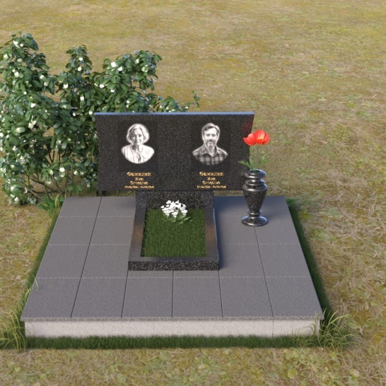 Форма стелы идеально подходит для размещения портретов усопших. Оптимальным будет расположить изображения симметрично, по обе стороны от центральной оси. Золотое тиснение имени и дат жизни гармонично впишется в общую композицию, добавив ей торжественности и благородства. Ваза из черного гранита, установленная рядом со стелой, станет прекрасным дополнением, позволяя близким возлагать цветы в память об ушедшем. Простая форма вазы не отвлекает внимание от самого памятника, а лишь подчеркивает его красоту и величие. Отсутствие излишних декоративных элементов позволяет сосредоточиться на главном – на памяти о человеке, который навсегда останется в наших сердцах. Полированная поверхность тумбы, расположенной перед стелой, отражает свет, создавая ощущение легкости и воздушности. Она может служить местом для возложения цветов или памятных вещей, которые дороги сердцу близких.