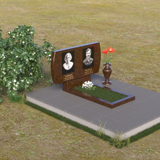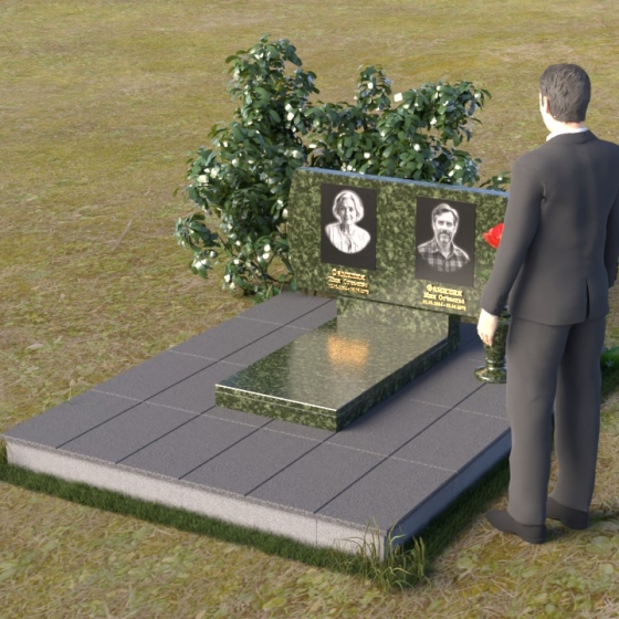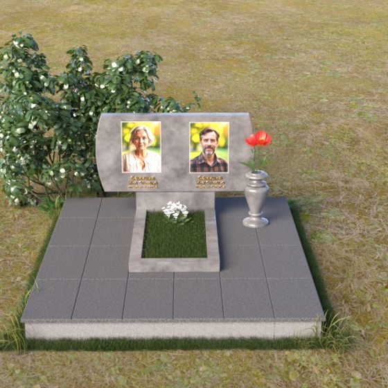 Композиция памятника строится на контрасте строгих геометрических форм и плавных линий, создавая гармоничный и запоминающийся образ. В верхней части возвышается стела из черного гранита, чья зеркальная полировка отражает небо и окружающий мир, словно напоминая о связи земного и небесного. Верхние углы стелы скруглены, смягчая строгость формы и придавая ей более мягкий, человечный облик. На стеле размещены портреты усопших, выполненные с высокой точностью и передающие их индивидуальность. Золотистые надписи имен и дат словно светятся на фоне черного камня, добавляя торжественности и значимости. У подножия стелы располагается горизонтальная плита, также выполненная из полированного черного гранита, создающая ощущение завершенности и устойчивости. Рядом – изящная ваза из того же материала, предназначенная для живых цветов, символа неувядающей памяти и любви.