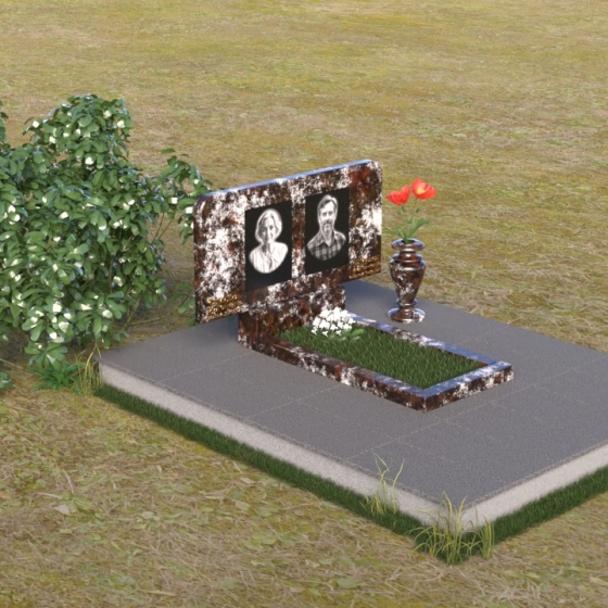 Этот ритуальное изделие – воплощение сдержанной элегантности и глубокого уважения. Прямоугольная стела с мягко скругленными углами создает ощущение завершенности и покоя. Верхняя часть памятника, словно рамка для воспоминаний, украшена выгравированными портретами. Полированная поверхность камня, подобно зеркалу, отражает свет, создавая игру бликов и теней, что придает глубину и объем изображениям. Горизонтальная плита под портретами добавляет композиции устойчивости и визуально расширяет пространство. Все элементы памятника объединены лаконичным дизайном, который говорит о достоинстве и вечной памяти.