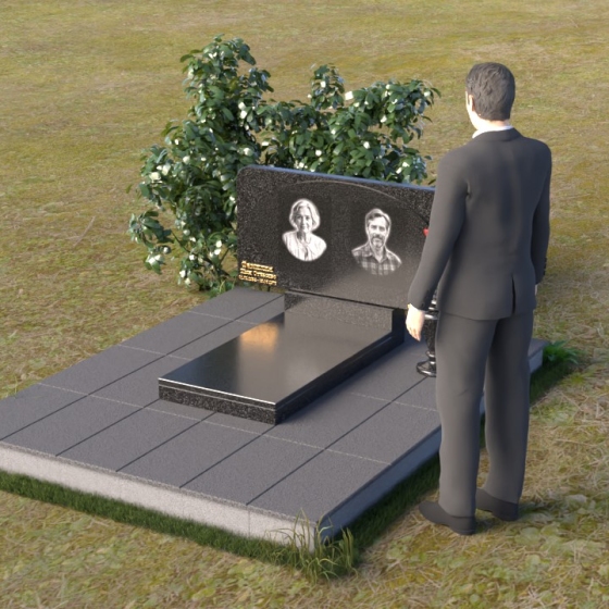 Форма стелы этого ритуального изделия идеально подходит для размещения двух портретов. Композиция с двумя изображениями, выполненными в технике гравировки, выглядит гармонично и сбалансированно. Под портретами можно расположить надпись с именем, датами жизни и короткой эпитафией. Золотое тиснение букв на черном граните создает эффект контраста и придает тексту дополнительную выразительность. Небольшая тумба, расположенная под стелой, служит подставкой для плиты с именами и годами жизни. Рядом с памятником можно установить вазу для цветов, выполненную в том же стиле и из того же материала, что и сам памятник. Это создаст единый ансамбль и подчеркнет целостность композиции. Дополнительно можно установить лампаду или небольшой фонарь, которые будут освещать памятник в темное время суток, создавая атмосферу умиротворения и светлой памяти.