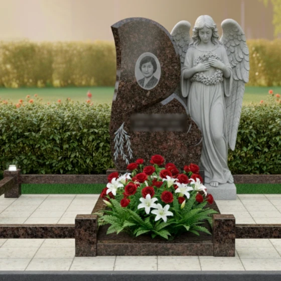 • Стела: Фигурная стела из полированного гранита с плавными очертаниями, символизирующими небесный свод. На стеле предусмотрено место для портрета и памятной надписи, а также изящной гравировки в виде ветви.