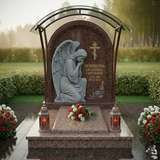 Плавные изгибы стелы, напоминающие мягкую волну, символизируют жизненный путь, его изменчивость и в то же время неизбежное движение к покою. Форма арки, обрамляющая фигуру ангела, ассоциируется с небесным сводом, защитой и переходом в иной мир. Скорбящий ангел – это мощный символ утешения, защиты и веры в бессмертие души. Он олицетворяет присутствие высших сил, оберегающих усопшего и дарующих покой его близким. Цветочная гравировка в нижней части стелы служит напоминанием о быстротечности жизни и ее красоте, а крест – о христианской вере и надежде на вечную жизнь. Вся композиция наполнена глубоким смыслом, призывая к осмыслению и принятию неизбежности, но при этом даруя утешение и надежду.