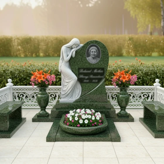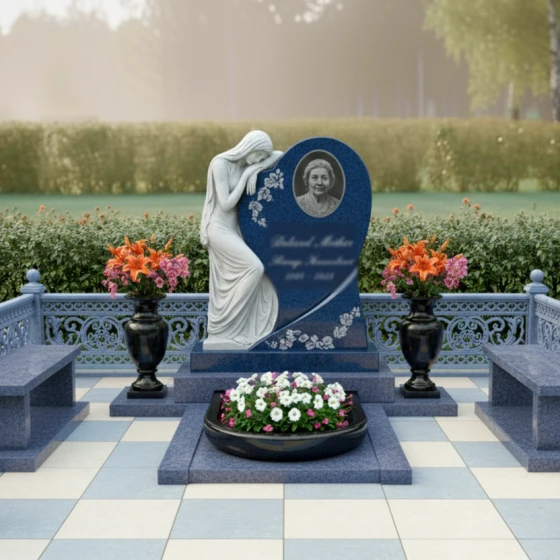 Эта мемориальная композиция, артикул ПН 103, представляет собой воплощение глубокой скорби и нежности, запечатленных в камне. В центре внимания — стела, выполненная в форме стилизованного сердца, которое плавно переходит в асимметричную волну. Этот изгиб не просто элемент дизайна, он символизирует бесконечность жизненного пути и неизбежность перехода в вечный покой, при этом сохраняя теплоту воспоминаний. Левая часть стелы увенчана изящной скульптурой скорбящей женщины. Её фигура, выполненная с невероятной детализацией, прислонилась к сердцу, выражая безмолвную печаль. Драпировка её одежд, кажется, струится по камню, создавая ощущение легкости и воздушности, несмотря на массивность материала. Контраст между зеркально отполированной поверхностью основного черного гранита и матовым, словно припорошенным инеем, срезом камня на фигуре скорбящей женщины, подчеркивает глубину эмоций и придает композиции особую выразительность. В правой части сердца, в обрамлении лаконичного овала, располагается место для портрета, словно медальон, хранящий драгоценный образ. Под портретом, на идеально гладкой поверхности, предусмотрено место для эпитафии, где каждое слово обретает особую значимость.