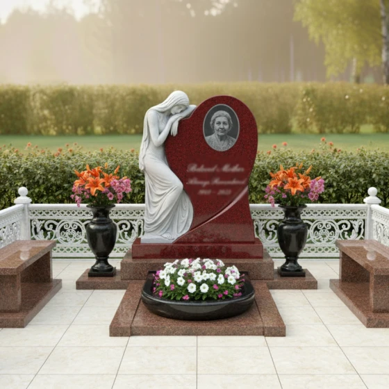 Форма этой мемориальной композиции предоставляет широкие возможности для индивидуального оформления. Сердцевидная часть стелы идеально подходит для размещения портрета усопшего. Овальное обрамление, в которое вписан образ, создает ощущение завершенности и фокуса, при этом не перегружая композицию. Под портретом достаточно места для выгравированной эпитафии, дат жизни, или символических изображений, которые дополнят историю. Благодаря гладкой, полированной поверхности, гравировка будет выглядеть четко и выразительно, а светлые матовые элементы резьбы внесут дополнительный контраст и объем. Эта форма стелы позволяет экспериментировать с различными стилями гравировки – от классических портретов до художественных изображений, которые подчеркнут уникальность личности. Возможно также нанесение на обратную сторону стелы дополнительных символов или памятных надписей, сохраняя при этом общую гармонию и элегантность комплекса.