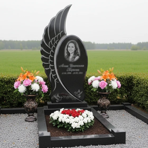 Кому подойдет: Этот мемориальный комплекс идеально подойдет для тех, кто ищет не просто памятник, а уникальное произведение искусства, способное глубоко и трогательно выразить светлую память о близком человеке. Его плавные, обтекаемые формы и символика крыла делают его особенно подходящим для увековечивания памяти о женщинах, чья жизнь была наполнена нежностью, грацией и духовностью. Мемориал станет достойным символом вечного покоя и возвышенной памяти, отражая индивидуальность и значимость ушедшего. Возможность выбора из 8 цветовых решений — 7 видов гранита (гранит амфиболит, гранит Балтик грин, гранит Блю Перл, гранит Габбро-диабаз, гранит Дымовский, гранит Лезниковский, гранит Мансуровский) и 1 вид мрамора (мрамор Тассо) — позволяет подобрать камень, который наиболее точно соответствует характеру и предпочтениям усопшего, создавая по-настоящему персонализированный и глубоко символичный мемориал.