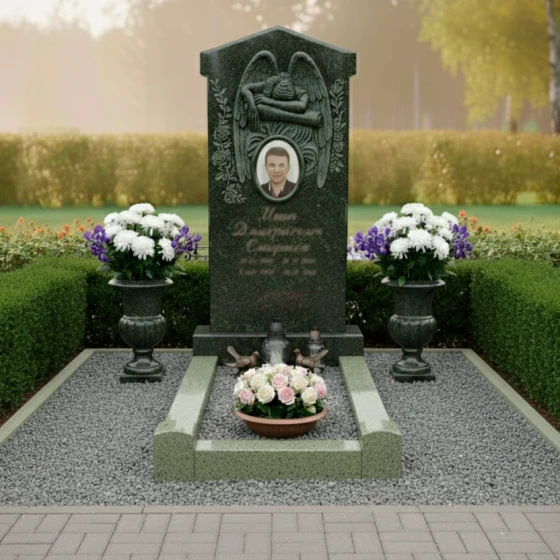Эта мемориальная композиция отличается гармоничным сочетанием строгих линий и нежных, плавных изгибов, создающих ощущение умиротворения и вечного покоя. Центральным элементом является высокая, величественная стела, выполненная в форме прямоугольника с изящно скругленными верхними углами, что придает ей мягкость и утонченность. Верхняя часть стелы украшена объемным барельефом в виде распростертых крыльев ангела, бережно обнимающих пространство над портретом усопшего. Каждое перо крыльев тщательно проработано, создавая игру света и тени на матовой, бархатистой поверхности камня, в то время как основное поле стелы имеет глубокую, зеркальную полировку, отражающую небо и окружающий мир. В центре композиции, под крыльями, расположено овальное обрамление для фотографии, словно окошко в светлое прошлое, а под ним — гравировка имени и дат, выполненная с особой аккуратностью и почтением.