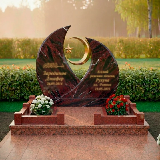Модель ПН 157 представляет собой истинное произведение искусства, воплощенное в камне, призванное стать вечным символом памяти и уважения. Величественная стела, выполненная в глубоком черном цвете, мгновенно притягивает взгляд своей необычной, но гармоничной формой. Ее силуэт напоминает два полумесяца, обращенных друг к другу, создавая динамичную композицию, которая символизирует единство и бесконечность. В центре этой дуальности, словно небесное светило, парит золотистый полумесяц, в объятиях которого покоится изящная пятиконечная звезда. Этот центральный элемент выполнен с ювелирной точностью, его отполированная до зеркального блеска поверхность отражает свет, создавая ощущение невесомости и духовности. Грани стелы тщательно обработаны, демонстрируя безупречную гладкость и плавные переходы, которые подчеркивают естественную красоту камня. Зеркальная полировка черного гранита создает эффект глубокого космоса, в котором каждый луч света играет и преломляется, обещая сохранить свой первозданный блеск на столетия, неподвластный времени и стихиям.