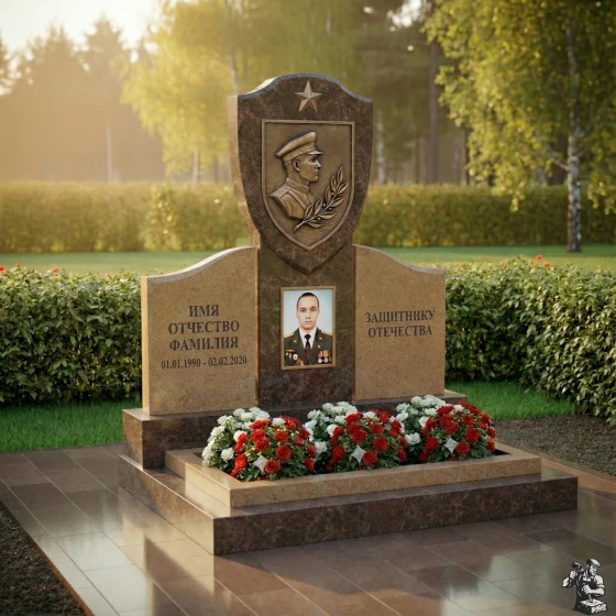 Центральное место в композиции занимает верхняя часть стелы, выполненная в форме геральдического щита, увенчанного пятиконечной звездой — символом воинской доблести и славы. На щите расположен объемный бронзовый барельеф, изображающий профиль мужчины в военной форме, окруженный лавровой ветвью — традиционным знаком победы и мира. Этот элемент придает монументу особую торжественность и подчеркивает героический характер личности. Под щитом, на основной части стелы, расположена глубокая ниша, предназначенная для портрета, который словно вписан в камень, становясь его неотъемлемой частью. Текст «ИМЯ ОТЧЕСТВО ФАМИЛИЯ» и даты жизни выполнены четким, строгим шрифтом, а справа расположена надпись «ЗАЩИТНИКУ ОТЕЧЕСТВА», выгравированная с особым почтением. Контраст между идеально отполированной черной поверхностью камня и матовыми, глубоко выгравированными элементами создает динамичное визуальное восприятие, подчеркивая значимость каждой детали.
