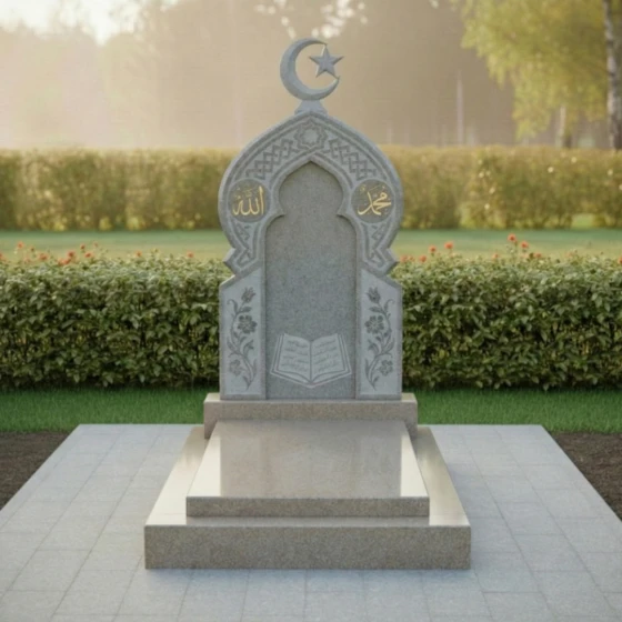 Ритуальное изделие артикула ПН 510 представляет собой глубокое художественное осмысление вечности и памяти, воплощенное в камне. Это не просто надгробие, а целая архитектурная форма, призванная стать молчаливым свидетельством уважения и любви. Центральная стела, выполненная в глубоком черном цвете, символизирует безмятежность и покой, а ее очертания напоминают величественный вход в священное пространство. Верхняя часть стелы увенчана исламским полумесяцем со звездой, выполненным из светлого камня, что создает выразительный контраст и придает композиции духовную значимость.