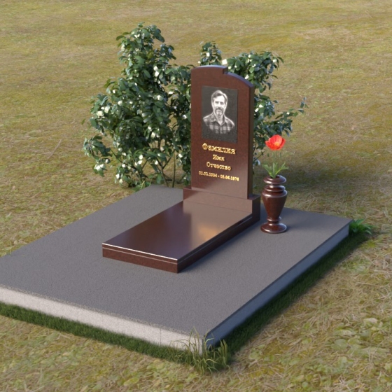 Геометрия модели продумана до мельчайших деталей. Начиная с основания, мы видим широкую плиту, обеспечивающую устойчивость всей конструкции. На ней возвышается горизонтальная плита меньшего размера, выполненная в зеркальной полировке, отражающая небо и окружающий мир, словно запечатлевая в себе мгновения жизни. Вертикальная стела, возвышающаяся над плитой, имеет сглаженные углы и плавные переходы, смягчающие строгость формы. Верхняя часть стелы, с ее деликатными сколами, придает ей уникальность и неповторимость. Рядом со стелой располагается небольшая ваза, выполненная в том же стиле, предназначенная для живых цветов, символизирующих вечную память и любовь.