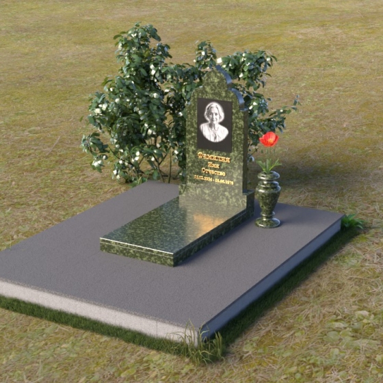 Основание композиции – прямоугольная плита с ровной, матовой поверхностью, обеспечивающая надежную устойчивость всей конструкции. На ней располагается горизонтальная плита, выполненная в виде усеченного параллелепипеда с зеркально отполированной поверхностью. Эта плита создает эффект глубины и отражает окружающий мир, словно запечатлевая моменты жизни ушедшего. Вертикальная стела возвышается над горизонтальной плитой, ее верхняя часть выполнена в форме изящной арки с плавными изгибами. Арка завершается небольшим декоративным элементом, напоминающим купол, что придает памятнику особую выразительность и духовность.