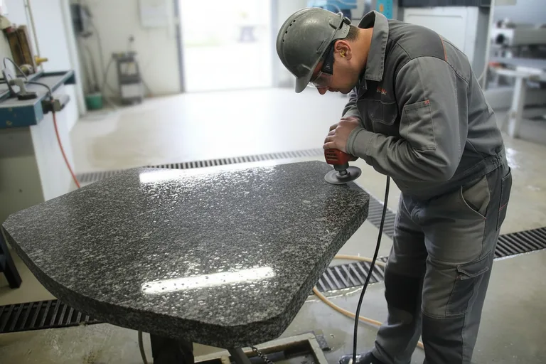 Полировка: Камень проходит до 7 этапов полировки, последовательно сменяя абразивные диски от грубых до тончайших войлочных кругов. Мы добиваемся глубокого зеркального блеска. Это не только эстетика - идеальная полировка закрывает естественные поры камня, делая его поверхность абсолютно гладкой и неуязвимой для влаги, пыли и грязи. Именно такая полировка раскрывает истинный цвет и глубину рисунка камня.